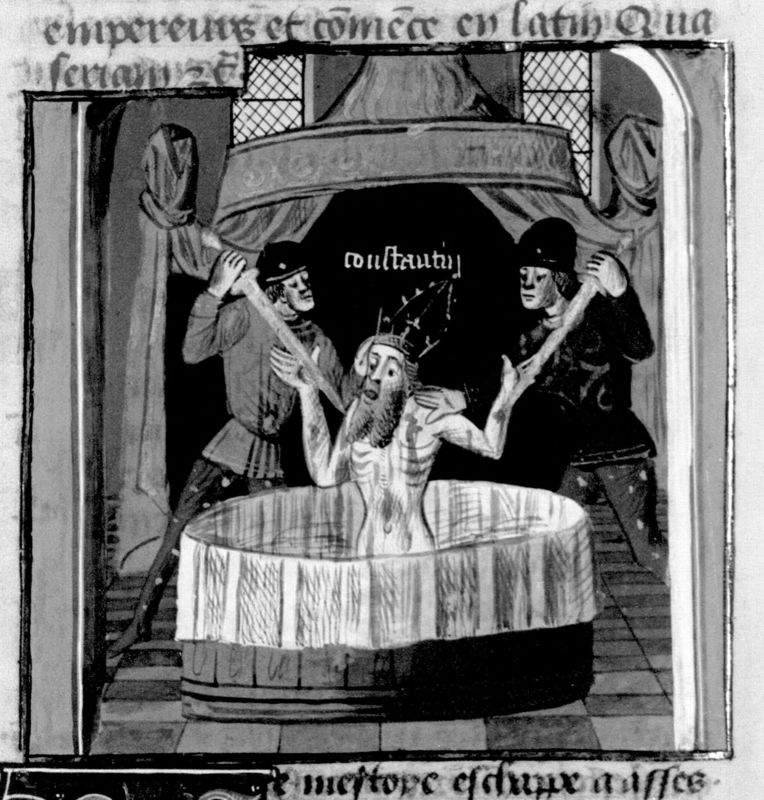 Parigi, Bibliothèque Nationale de France, Fr. 230, f. 246v. Il copista del manoscritto è P. Droulin. Costantino III viene assassinato nella vasca da bagno da due uomini.