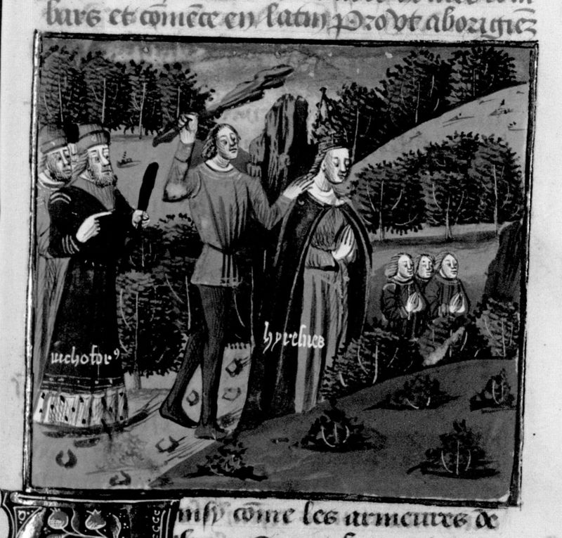 Parigi, Bibliothèque Nationale de France, Fr. 230, f. 247v. Il copista del manoscritto è P. Droulin. Romulda, duchessa del Friuli, viene impalata.