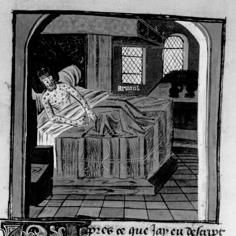 Parigi, Bibliothèque Nationale de France, Fr. 230, f. 251r. Il copista del manoscritto è P. Droulin. Arnolfo di Carinzia giace a letto colpito dalla malattia.