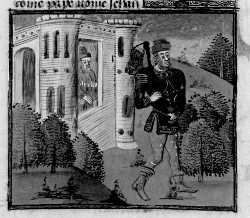 Parigi, Bibliothèque Nationale de France, Fr. 230, f. 226v. Il copista del manoscritto è P. Droulin. Giovanni Boccaccio incontra tre uomini.