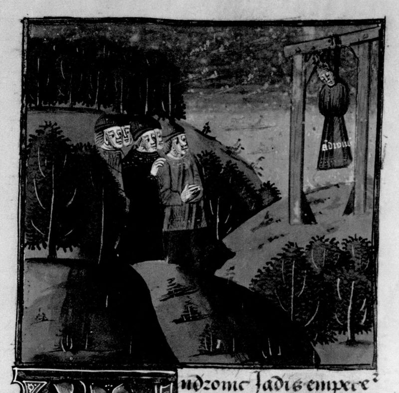Parigi, Bibliothèque Nationale de France, Fr. 230, f. 256r. Il copista del manoscritto è P. Droulin. L'imperatore Andronico viene impiccato ad una forca.