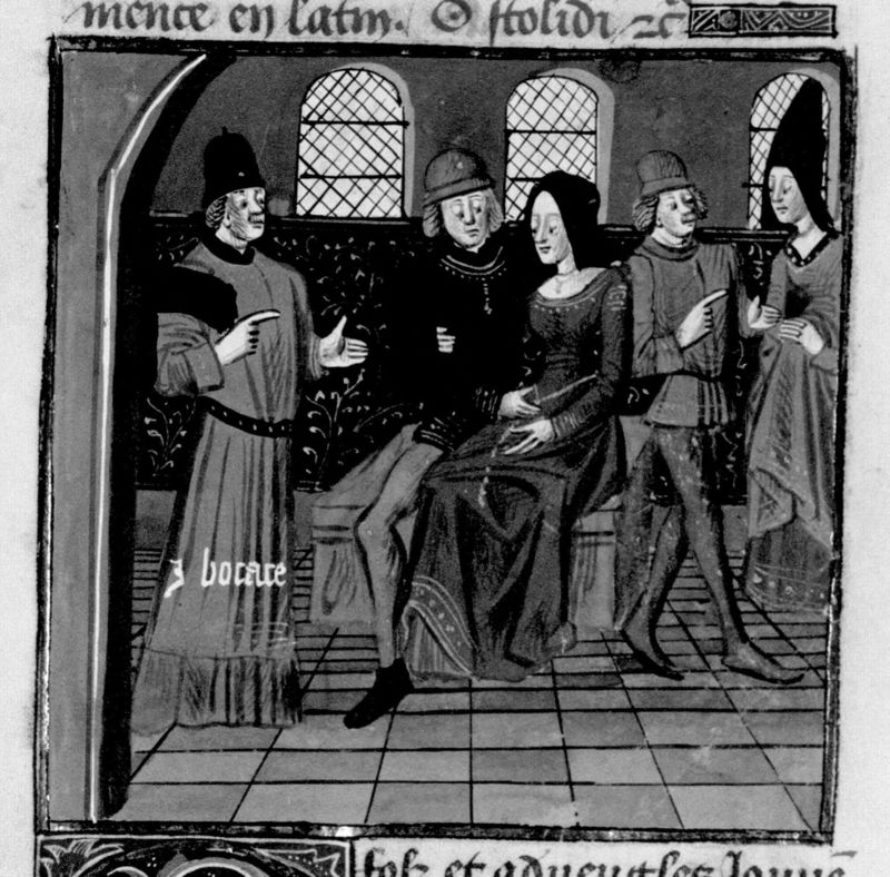 Parigi, Bibliothèque Nationale de France, Fr. 230, f. 257r. Il copista del manoscritto è P. Droulin. Giovanni Boccaccio condanna la lascivia di due coppie di amanti.