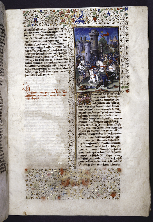 New York, Public Library, Spencer 33, f. 4r. Semiramide a cavallo guida l'esercito contro la città di Babilonia, difesa da alcuni soldati armati di balestre.