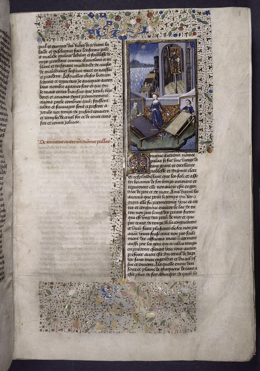 New York, Pierpont Morgan Library, M 381, f. 60r. Proba, seduta nel suo studio, sfoglia alcuni libri.
