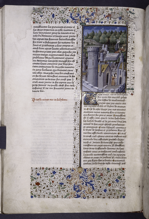 New York, Public Library, Spencer 33, f. 10v. Due messaggeri inviati da Giove scelgono la giovane Europa, mentre lì accanto due tori si fronteggiano; nel tempio in secondo piano un…
