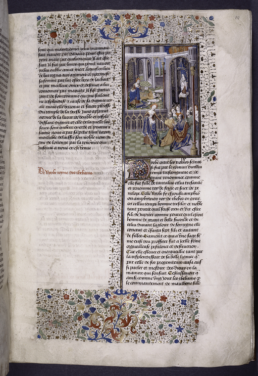 New York, Public Library, Spencer 33, f. 7r. La dea Cerere, accompagnata da tre donne, insegna ai contadini ad arare, mietere e seminare; all'interno del tempio un gruppo di fedeli…