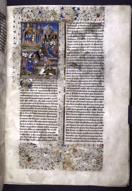 New York, Public Library, Spencer 33, f. 16r. Medea e Giasone osservano un servitore fare a pezzi Apsirto, fratello di Medea; Medea presenta a Giasone i loro figli morenti; sullo s…