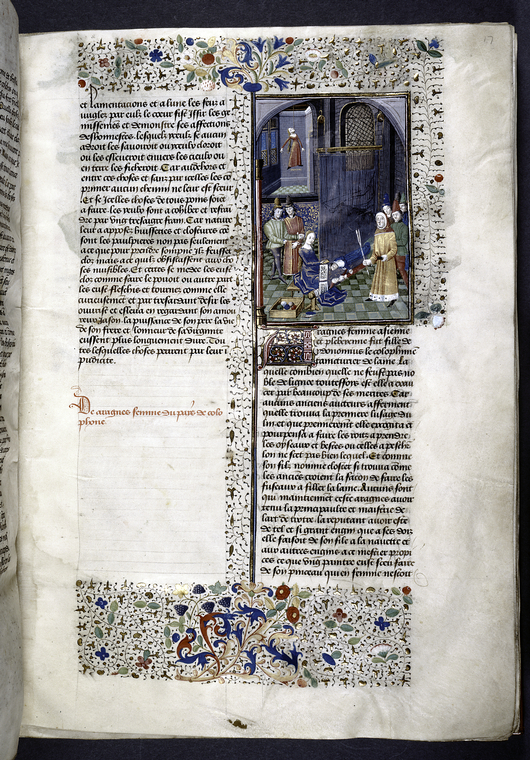 New York, Public Library, Spencer 33, f. 17r. Aracne, seduta al telaio, riceve l'ammirazione degli uomini per la sua arte tessile; Aracne impiccata al soffitto della sua stanza.