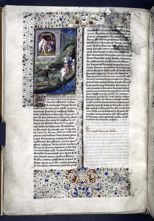 New York, Public Library, Spencer 33, f. 19v. Il centauro Nesso, mentre fugge lungo il fiume dopo aver rapito Deianira, viene colpito da una freccia di Ercole e si tampona la ferit…
