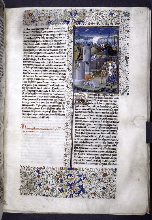 New York, Public Library, Spencer 33, f. 21r. Nicostrata giunge con il figlio Evandro presso Roma ed i cittadini erigono una porta della città in suo onore; sullo sfondo le navi di…