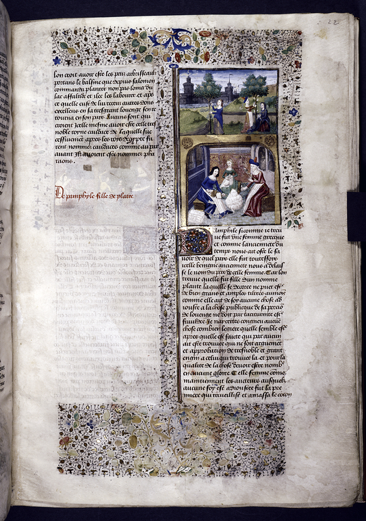 New York, Public Library, Spencer 33, f. 22r. Panfila raccoglie i bachi da seta fuori dalle mura cittadine con l'aiuto di due serve; Panfila carda la seta mentre due aiutanti la p…
