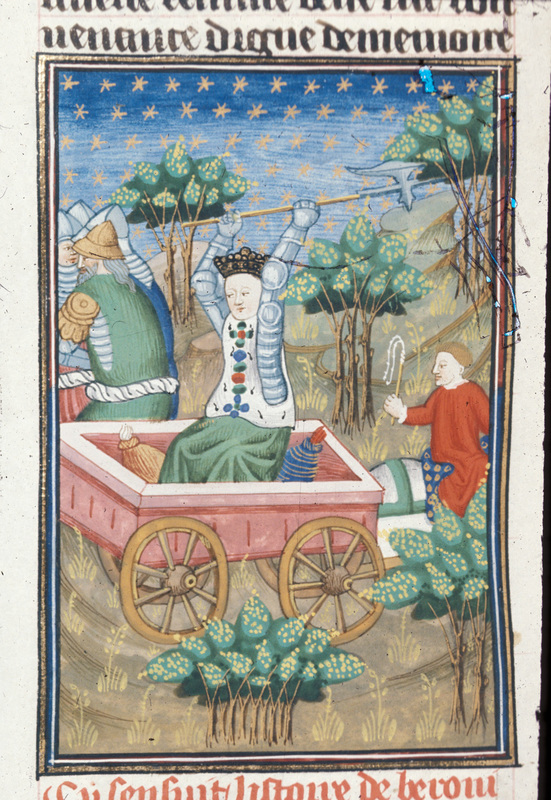 Londra, British Library, Royal 16 G V, f. 86v. Beronice sul carro da guerra mette in fuga degli uomini armati.