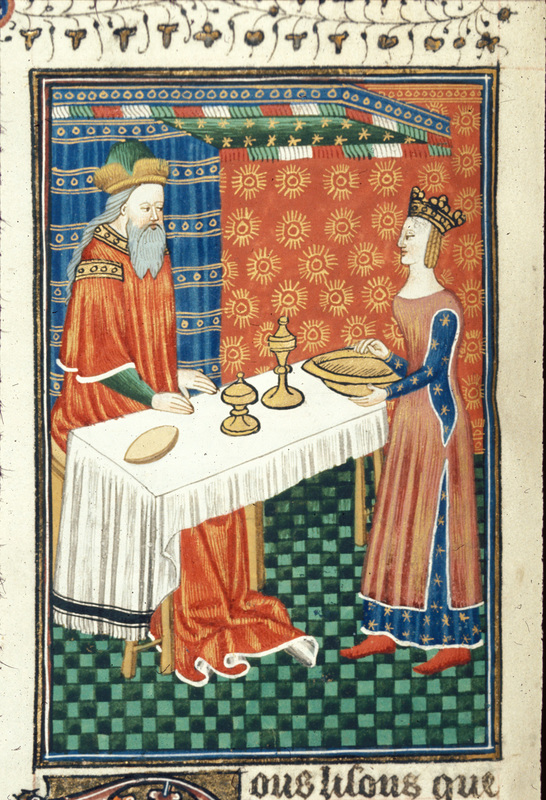 Londra, British Library, Royal 16 G V, f. 89v. Dripertua, caratterizzata dal naso mostruosamente grande, serve Mitridate seduto a tavola.