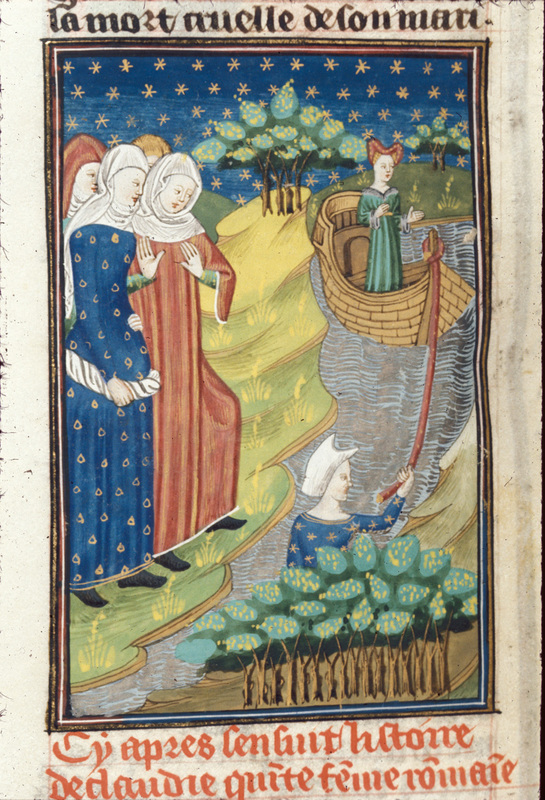 Londra, British Library, Royal 16 G V, f. 90v. Claudia Quinta dalla riva del fiume traina con la propria cintura la barca su cui viaggia la statua della Magna Mater; poco lontano u…