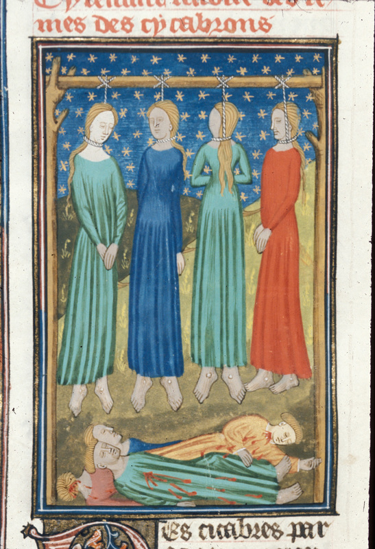 Londra, British Library, Royal 16 G V, f. 94v. Le mogli dei Cimbri vengono impiccate accanto ai corpi dei loro mariti.