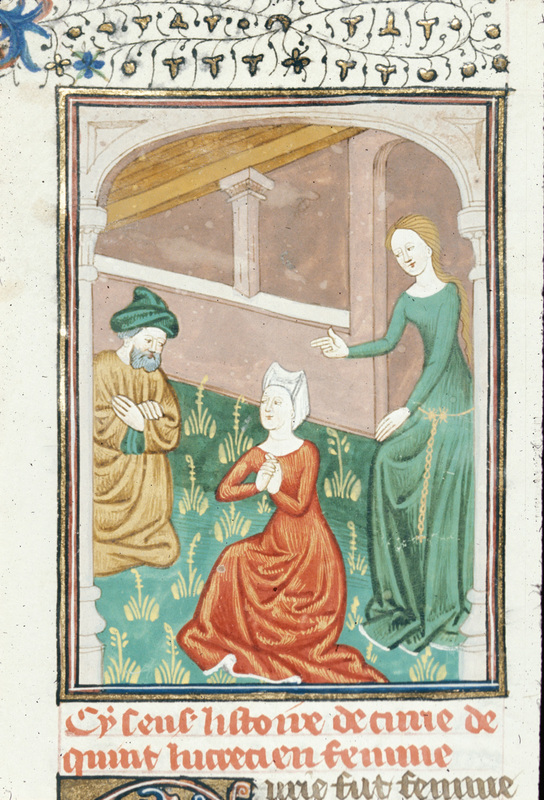 Londra, British Library, Royal 16 G V, f. 104v. Antonia, rimasta vedova, rifiuta i suoi pretendenti.