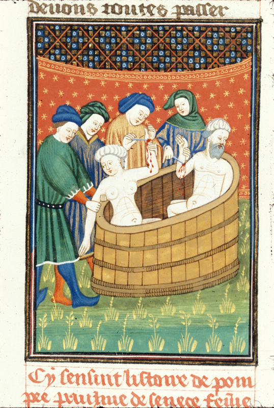 Londra, British Library, Royal 16 G V, f. 110r. Pompeia Paulina si suicida insieme al marito Seneca tagliandosi le vene nella vasca da bagno, assistita da quattro servitori.