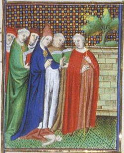 Londra, British Library, Royal 20 C V, f. 158v. L'imperatore Ottone ordina il matrimonio tra Gualdrada e il conte Guido.