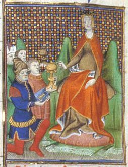 Londra, British Library, Royal 20 C V, f. 165v. La regina Giovanna I seduta in trono riceve dei doni dagli uomini inginocchiati al suo cospetto.