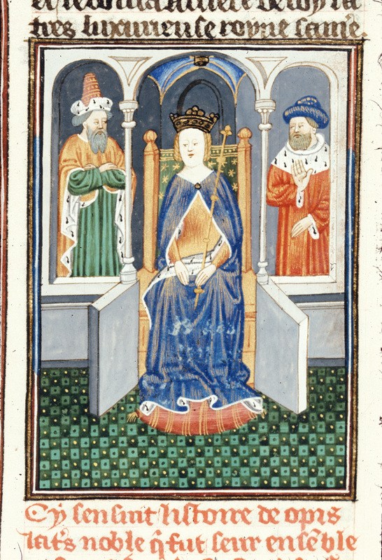 Londra, British Library, Royal 16 G V, f. 8r. Opi siede sul trono, fiancheggiata da due nobili sudditi.
