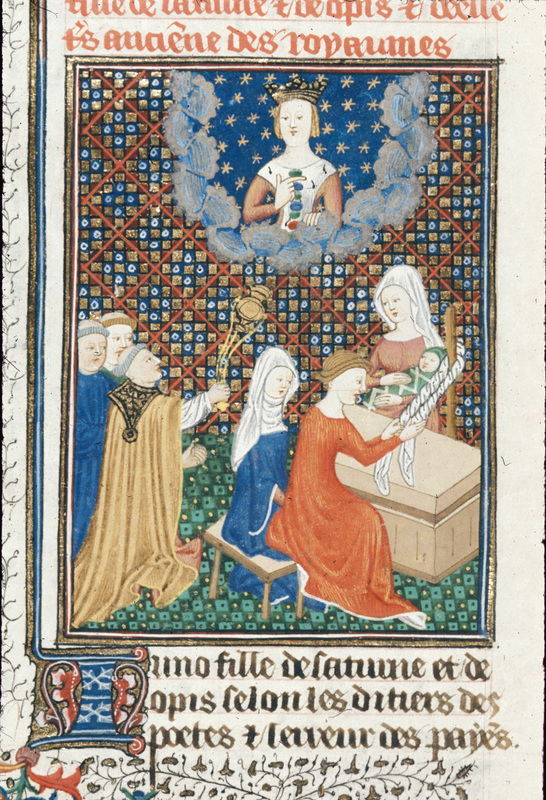Londra, British Library, Royal 16 G V, f. 8v. Giunone riceve le suppliche dei sacerdoti e di una partoriente.