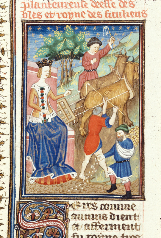 Londra, British Library, Royal 16 G V, f. 9v. Cerere insegna a tre contadini ad arare, seminare e trebbiare.
