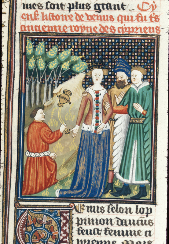 Londra, British Library, Royal 16 G V, f. 12r. Venere accanto a Vulcano, Adone e un uomo devoto inginocchiato che reca un turibolo.