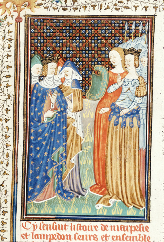Londra, British Library, Royal 16 G V, f. 14r. Le regine delle Amazzoni Marpesia e Lapedone si incontrano, ciascuna accompagnata dal proprio seguito.