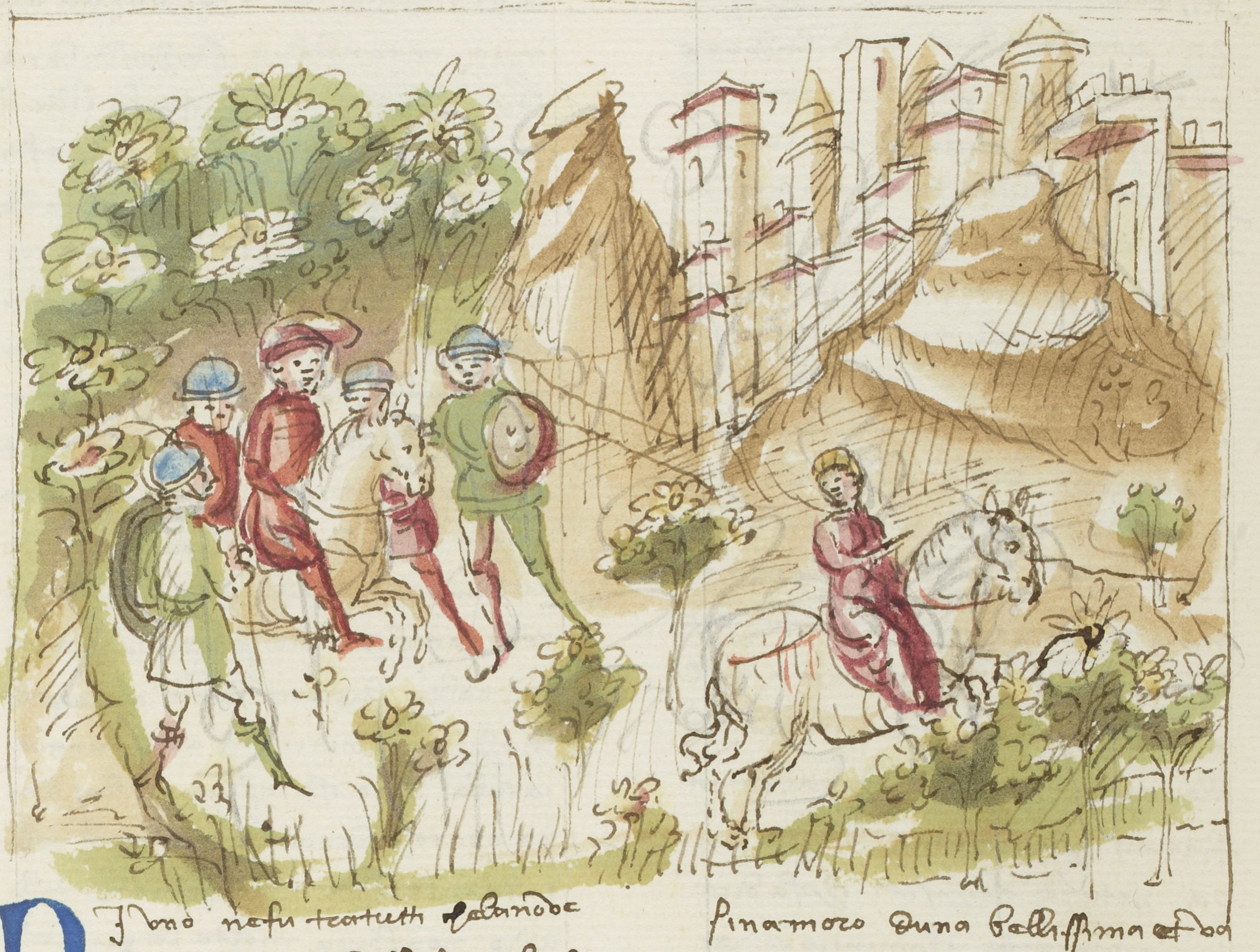 Parigi, Bibliothèque Nationale de France, It. 63, f. 172v. Il copista del manoscritto, datato 10 ottobre 1427, è Ludovico di Salvestro Ceffini. Pietro Boccamazza viene aggredito nel bosco dai briganti, mentre l'Agnolella riesce a fuggire a cavallo.