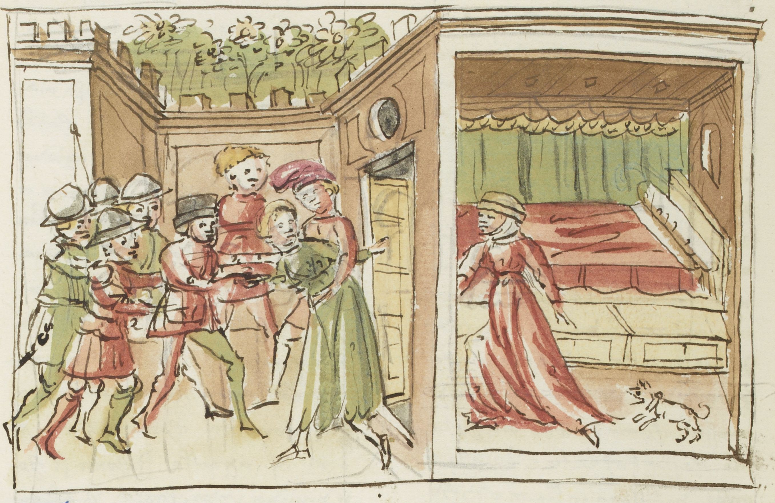 Parigi, Bibliothèque Nationale de France, It. 63, f. 178v. Il copista del manoscritto, datato 10 ottobre 1427, è Ludovico di Salvestro Ceffini. Giannole e Minghino scatenano una rissa nel tentativo di rapire Agnesa, mentre una serva accorre da dentro la casa.