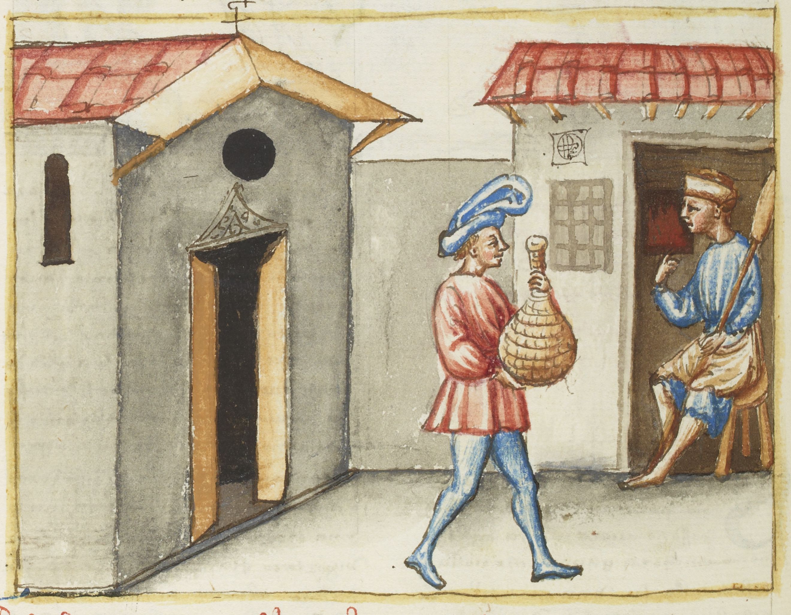 Parigi, Bibliothèque Nationale de France, It. 63, f. 196v. Il copista del manoscritto, datato 10 ottobre 1427, è Ludovico di Salvestro Ceffini. Un servo si reca da Cisti fornaio con un fiasco per comprare del vino.