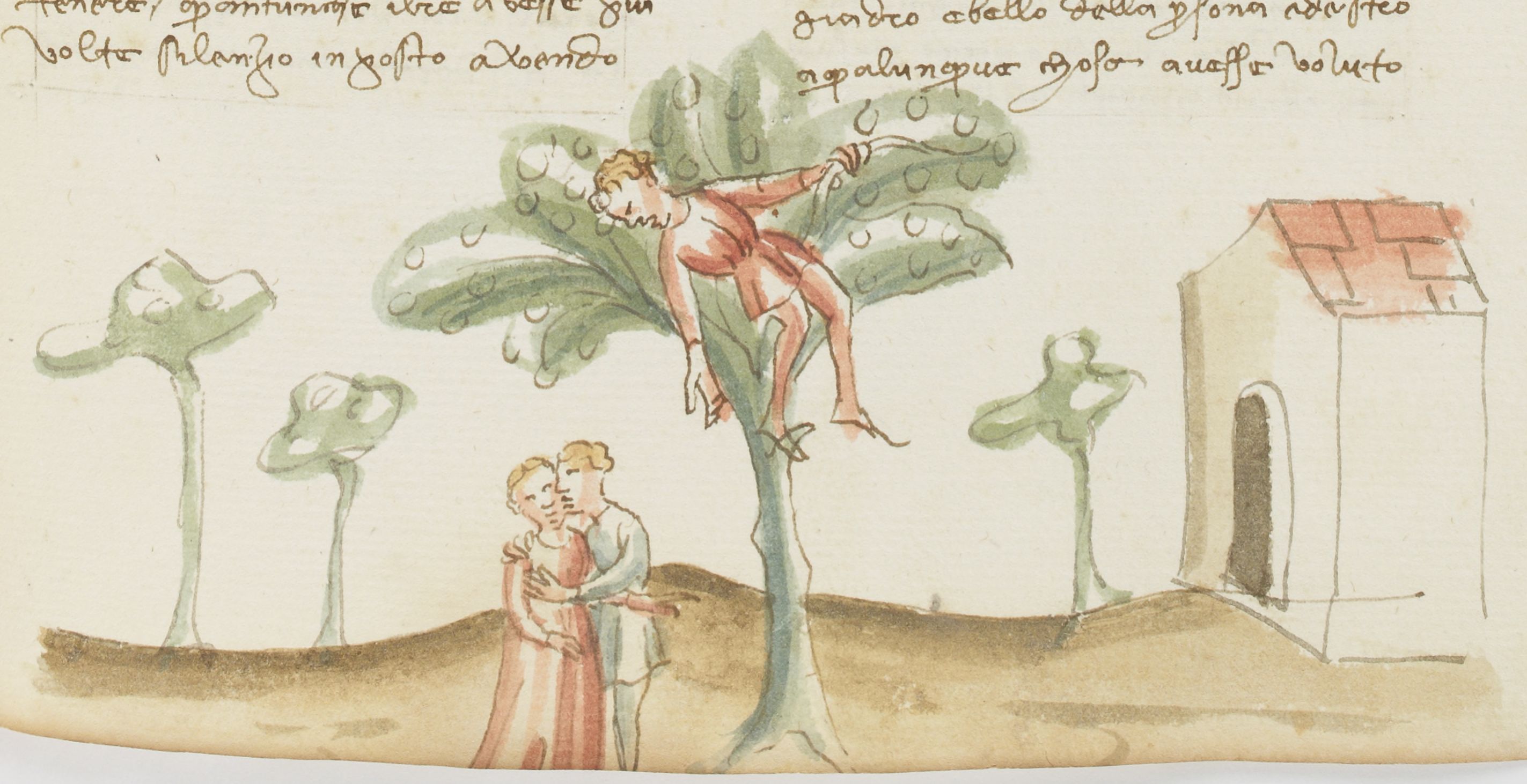 Parigi, Bibliothèque Nationale de France, It. 63, f. 225r. Il copista del manoscritto, datato 10 ottobre 1427, è Ludovico di Salvestro Ceffini. Arrampicatosi tra i rami di un pero, Nicostrato vede sua moglie Lidia e Pirro scambiarsi dei baci nel giardino.