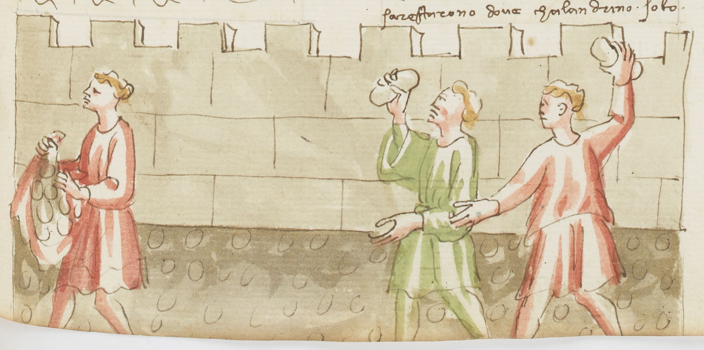 Parigi, Bibliothèque Nationale de France, It. 63, f. 234r. Il copista del manoscritto, datato 10 ottobre 1427, è Ludovico di Salvestro Ceffini. Bruno e Buffalmacco tirano delle pietre a Calandrino, il quale si crede invisibile.