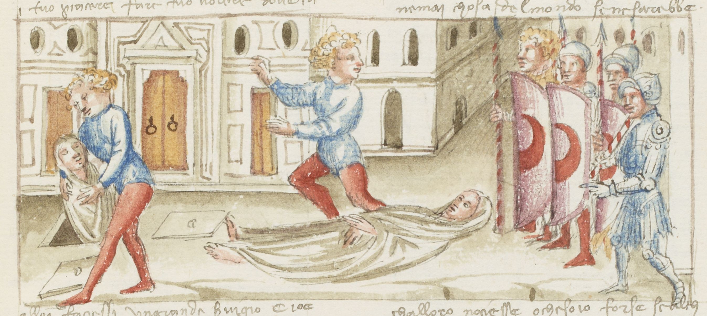 Parigi, Bibliothèque Nationale de France, It. 63, f. 262r. Il copista del manoscritto, datato 10 ottobre 1427, è Ludovico di Salvestro Ceffini. Rinuccio estrae dalla tomba Alessandro, il quale si finge morto; Rinuccio abbandona il corpo e si dà alla fuga all'arrivo delle guardie.