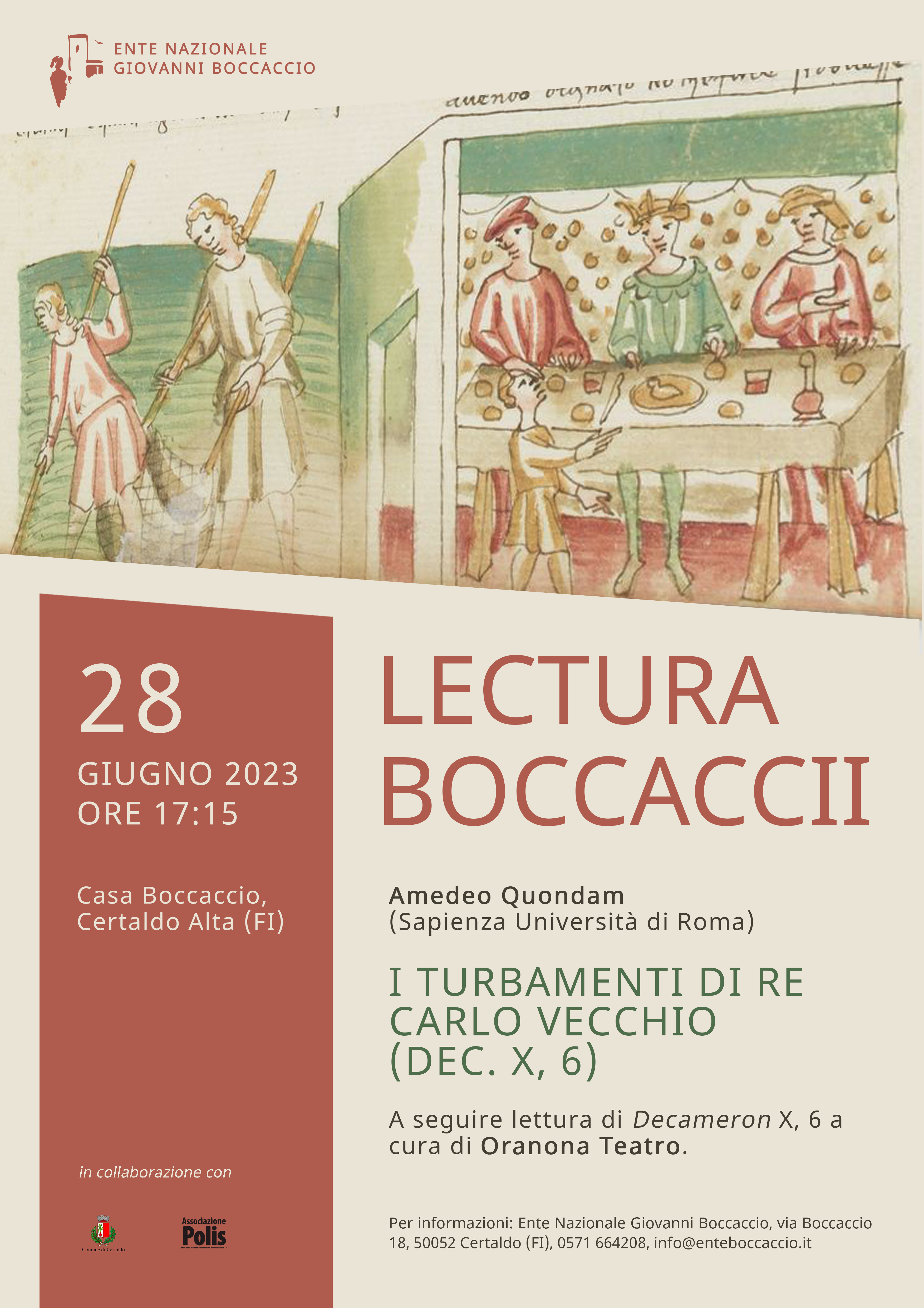 A seguire, visita guidata al Palazzo Pretorio di Certaldo e lettura della novella Decameron X, 6, a cura dell'Oranona Teatro: voce di Simona Lazzerini, al flauto traverso Angela Cenci.
