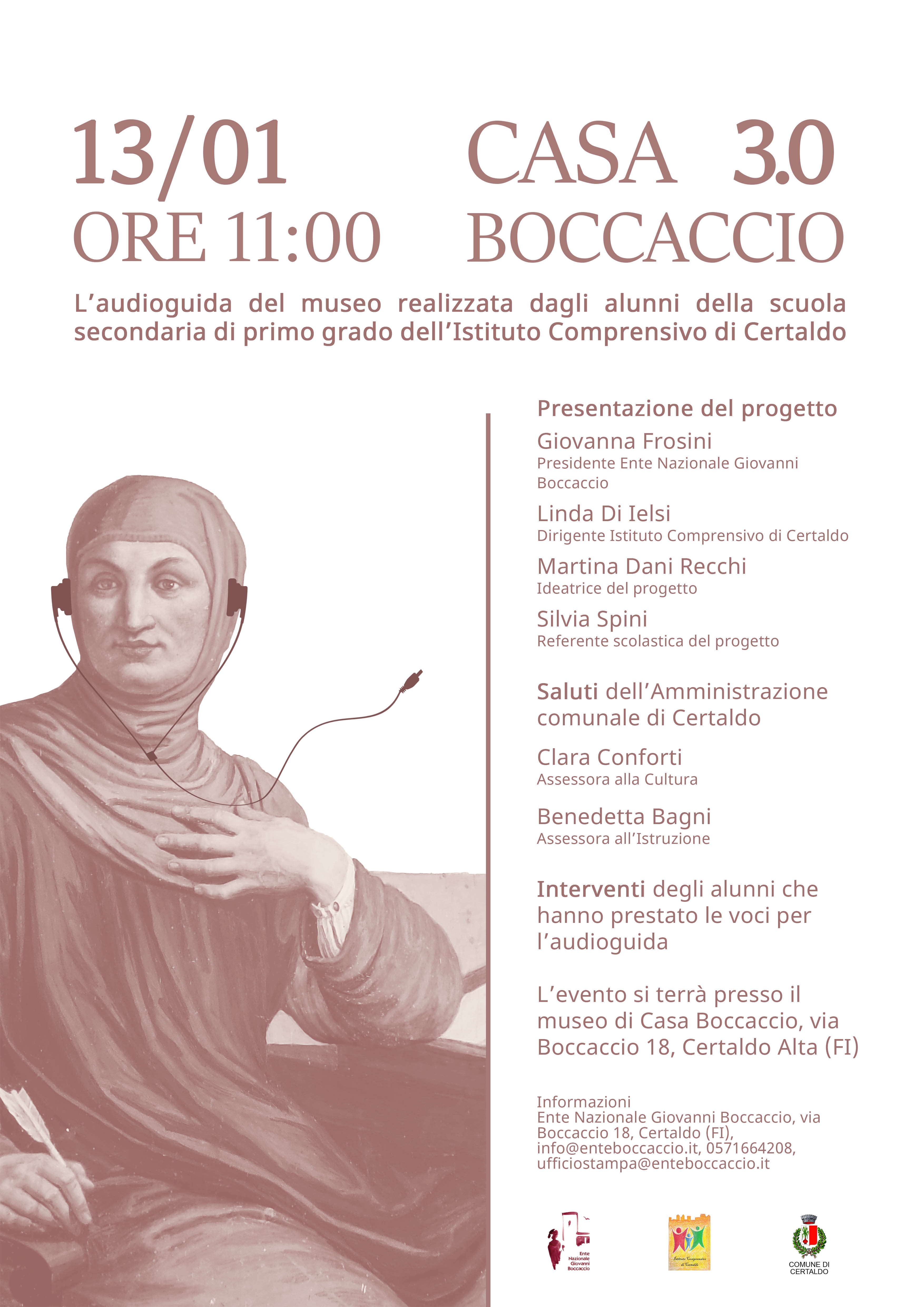 Il progetto, che ha preso avvio a maggio 2023, ha visto la realizzazione di un’audioguida per i visitatori del museo di Casa Boccaccio registrata dagli alunni della scuola secondaria di primo grado. Tutti i dettagli saranno illustrati sabato 13 gennaio in occasione della presentazione.