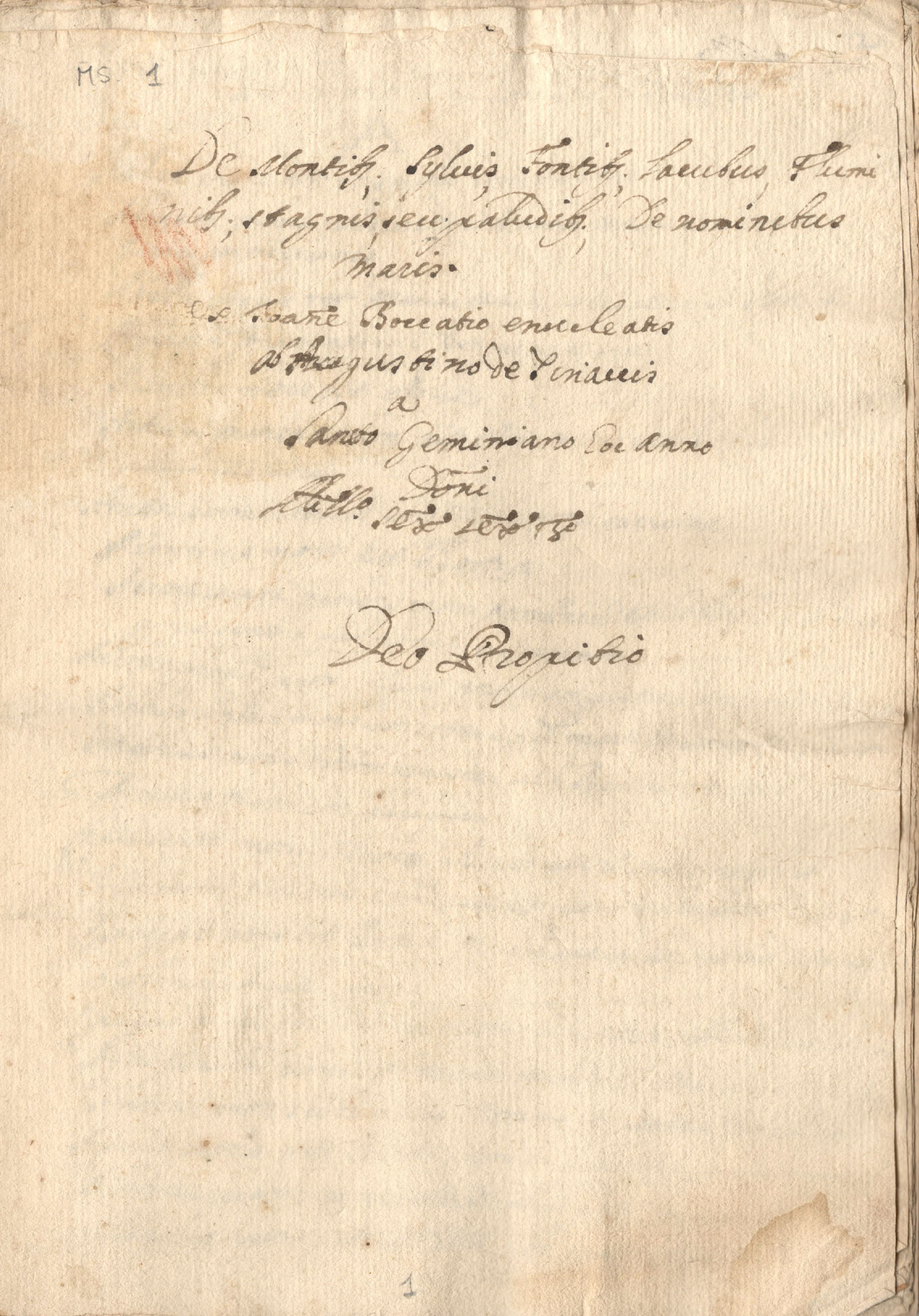 A f. 1r: De montibus, sylvis, fontibus, lacubus, fluminibus, stagnis seu paludibus, de nominibus