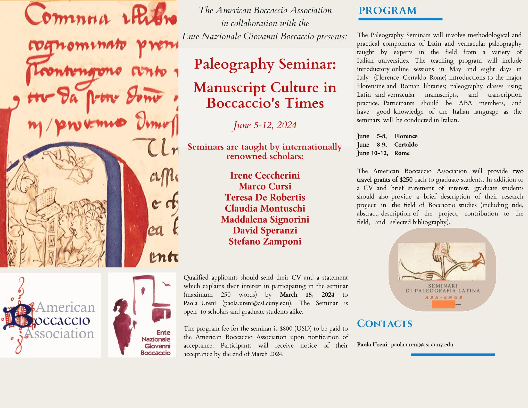 The program fee for the seminar is $800 (USD) to be paid to the American Boccaccio association upon notification of acceptance. Participants will receive notice of their acceptance by the end of March 2024.Program: