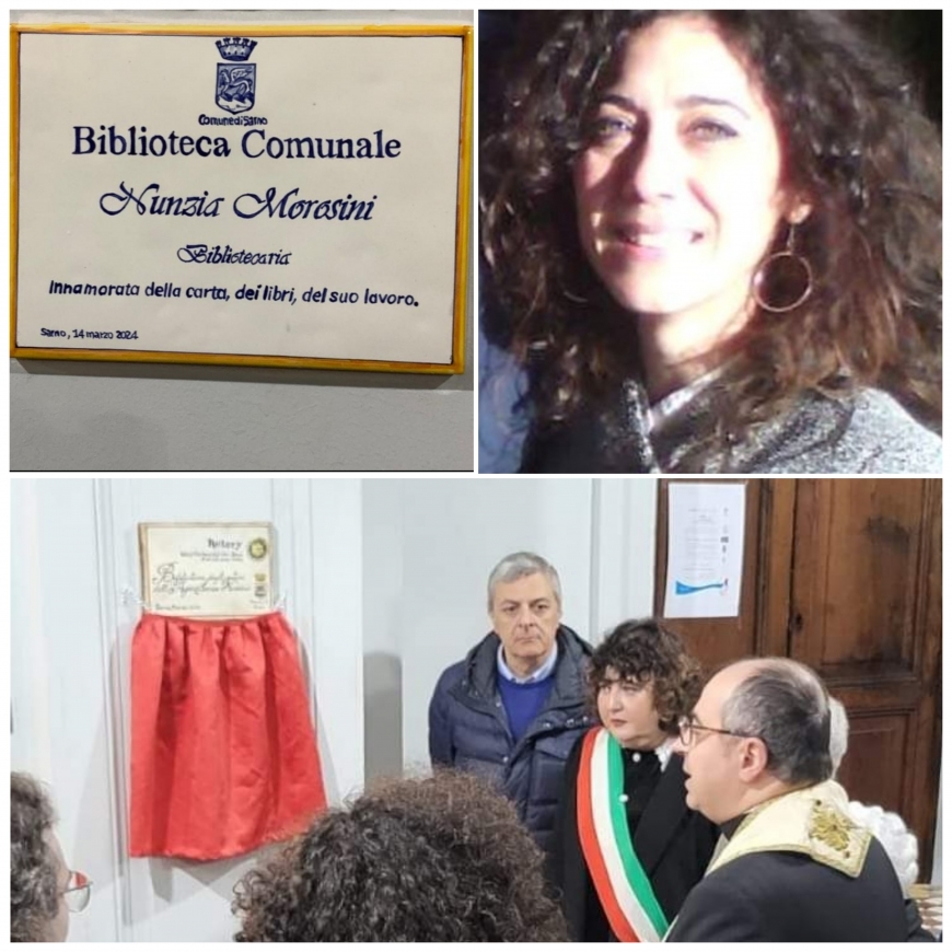 Nel pomeriggio di oggi, 14 marzo 2024, nei locali di villa Lanzara, adibiti a Biblioteca comunale, è stata scoperta la targa di intitolazione a Nunzia Morosini, morta prematuramente il 27 ottobre 2022, all' età di 55 anni.