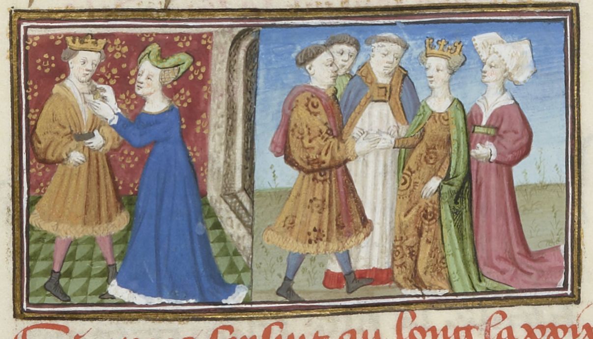 Parigi, Bibliothèque Nationale de France, Fr. 239, f. 102v. Giletta, in cambio di una cura per il re, chiede in sposo Beltramo di Rossiglione; il re fa sposare Giletta e Beltramo.