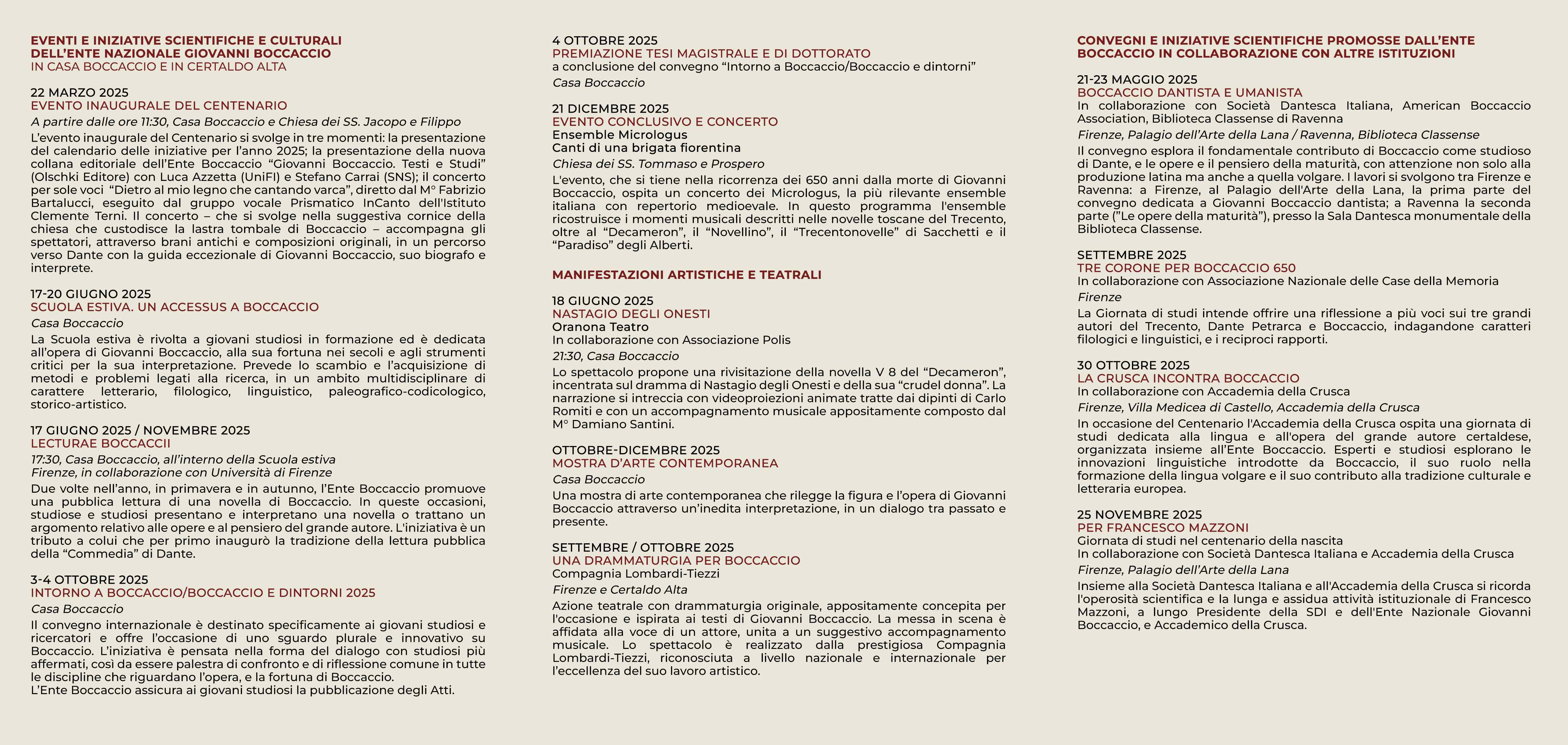 Il 20 settembre 2025 convegno “Tre corone per Boccaccio 650”, in collaborazione con l’Associazione nazionale delle Case della Memoria, alla Biblioteca Nazionale Centrale a Firenze per offrire una riflessione a più voci sui tre grandi autori del Trecento, Dante Petrarca e Boccaccio, indagandone caratteri filologici e linguistici, e i reciproci rapporti.