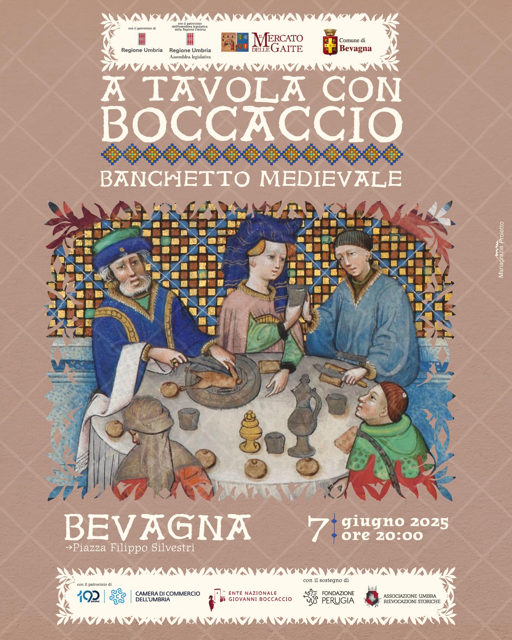 Per Boccaccio il cibo e la socialità dei convivi non sono la scenografia dei racconti né la sceneggiatura delle trame, ma la loro chiave di lettura. E dunque capire il cibo per capire gli uomini, ieri come oggi, è il senso di questo grande banchetto, che segna, con un approccio rigoroso e di alto profilo accademico, il ritorno del medioevo per le strade di Bevagna e rappresenta la seconda tappa verso il tradizionale Mercato delle Gaite (in programma quest’anno dal 18 al 29 giugno)
