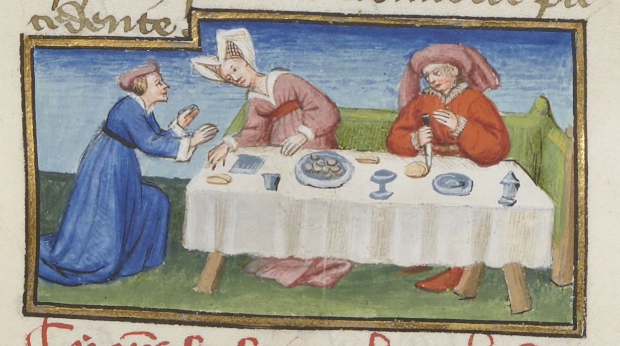 Parigi, Bibliothèque Nationale de France, Fr. 239, f. 134r. Guglielmo Rossiglione fa servire alla moglie il cuore dell'amante Guardastagno, facendola svenire.