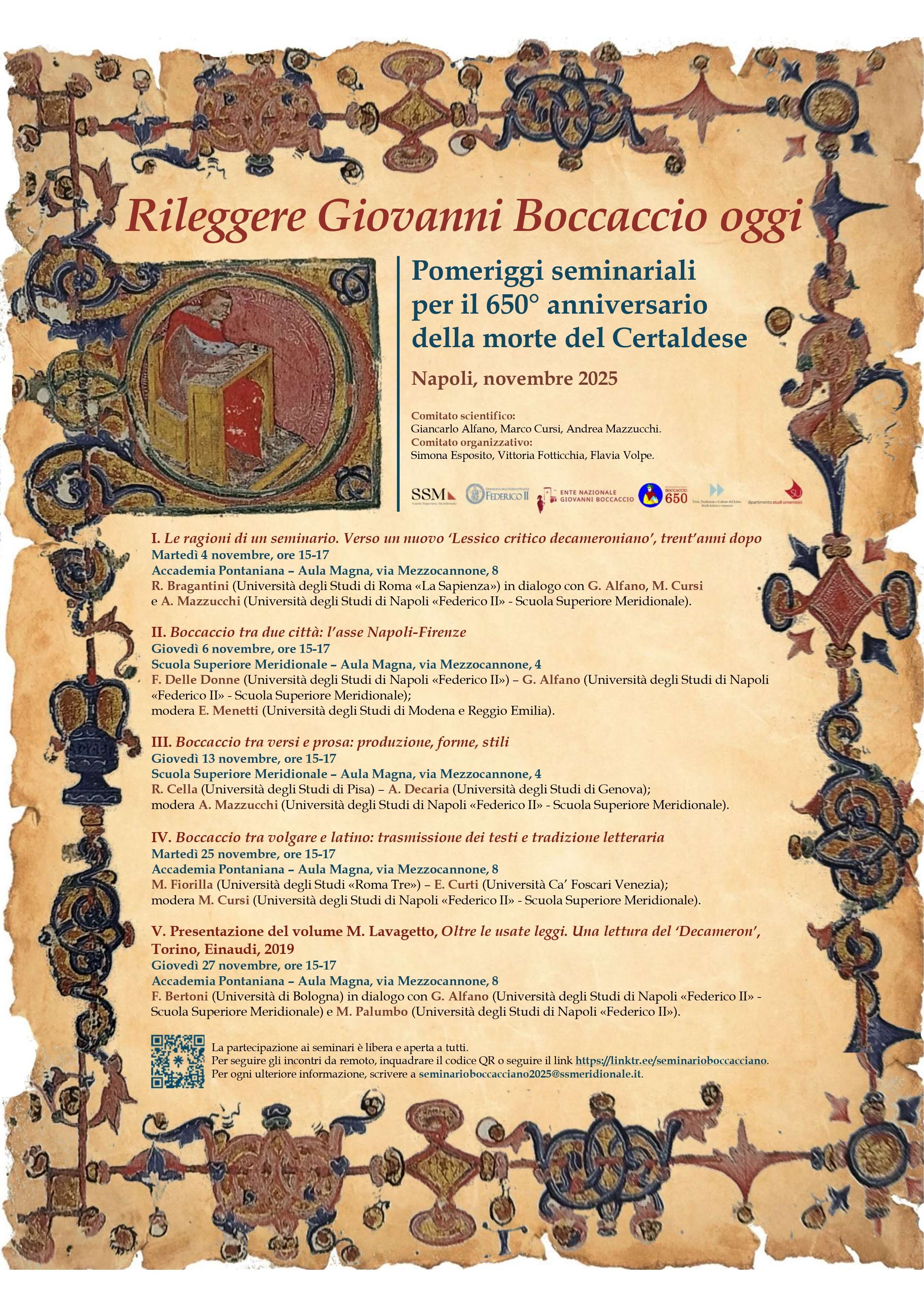 Ciclo di seminari promosso dalla Scuola Superiore Meridionale e dall’Università degli Studi di Napoli «Federico II», in occasione del 650° anniversario della morte di Boccaccio.