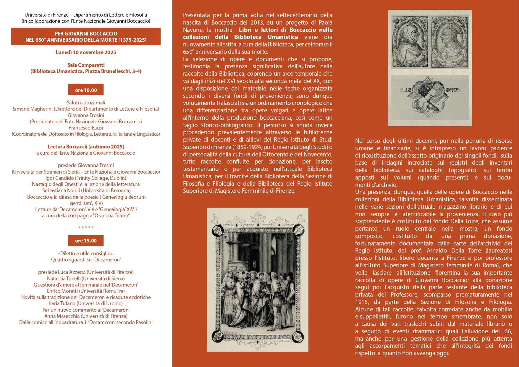 La mostra è collegata al Convegno: PER GIOVANNI BOCCACCIO NEL 650° ANNIVERSARIO DELLA MORTE (1375-2025), a cura del Dipartimento di Lettere e Filosofia dell’Università di Firenze e dell’Ente Nazionale Giovanni Boccaccio