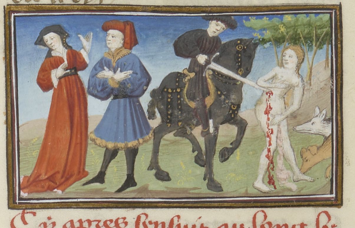 Parigi, Bibliothèque Nationale de France, Fr. 239, f. 159v. La figlia di Paolo Traversari rifiuta l'amore di Nastagio degli Onesti; un cavaliere in nero con una muta di cani insegue una donna nuda e la uccide.