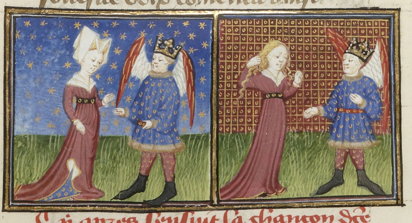 Scuola del Maestro del Duca di Bedford (1430 c.), Elissa canta davanti ad Amore; Elissa supplica Amore