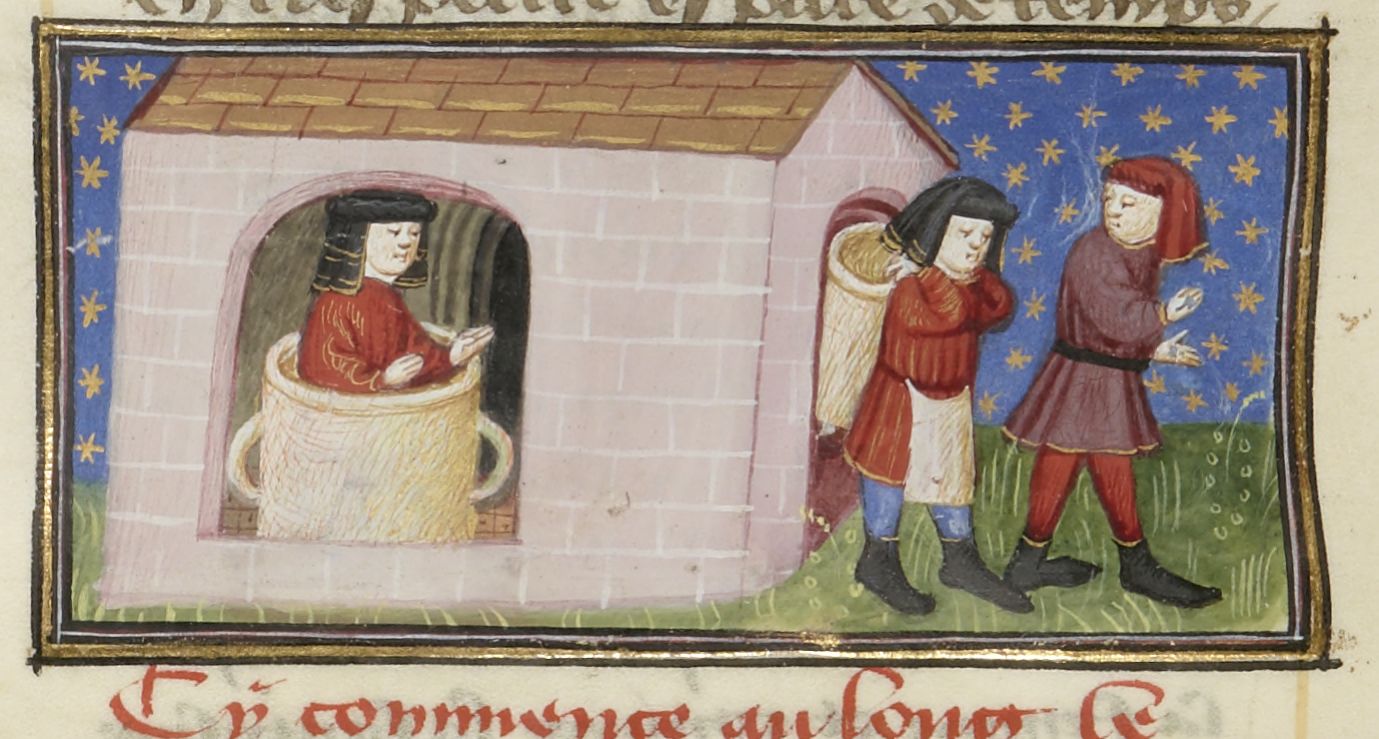 Parigi, Bibliothèque Nationale de France, Fr. 239, f. 187v. Il marito di Peronella entra nella botte per pulirla; l'uomo si fa convincere dalla moglie a trasportare la botte a casa di Giannello.