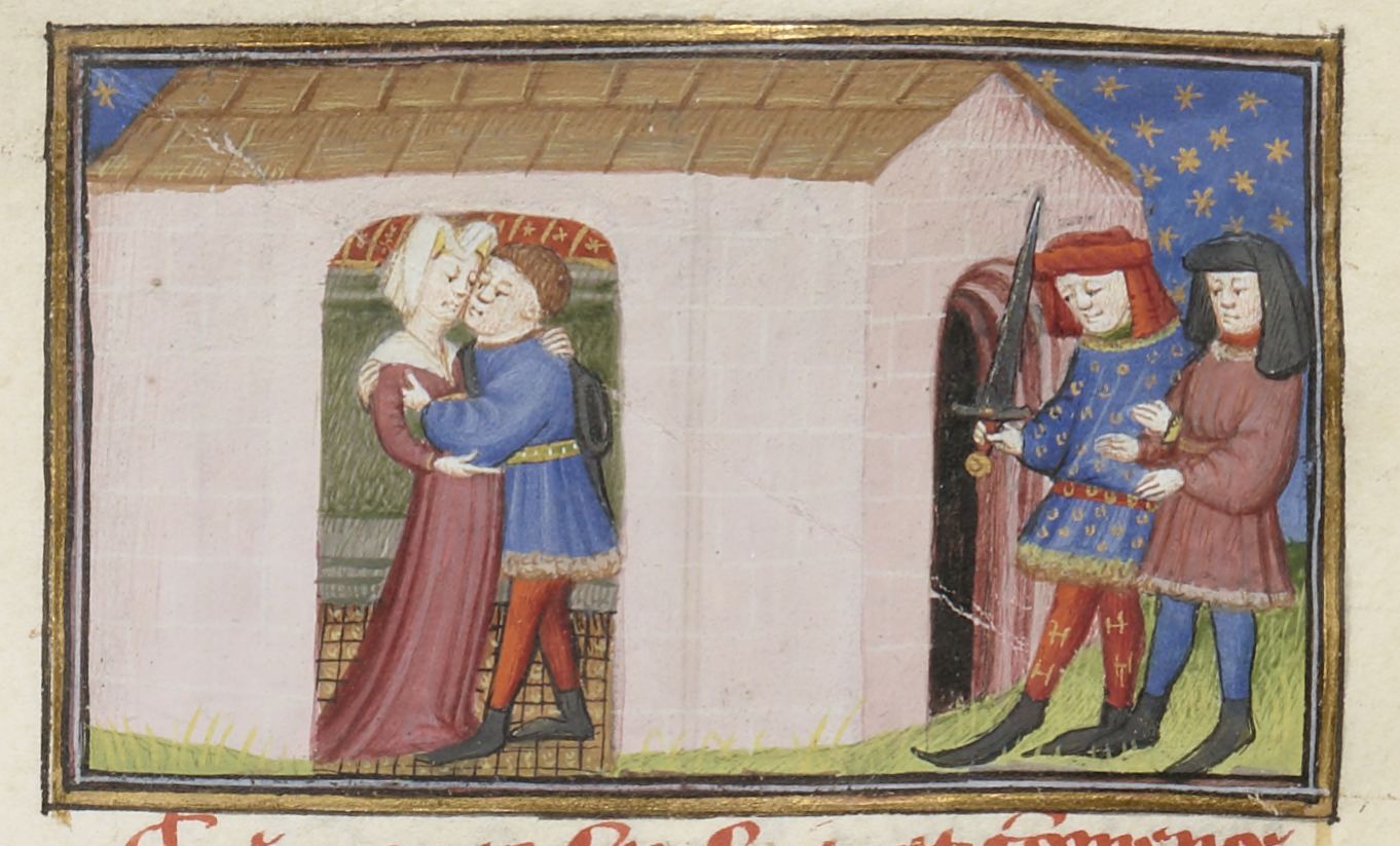 Parigi, Bibliothèque Nationale de France, Fr. 239, f. 197r. Isabella e Leonetto (?) si abbracciano di nascosto; il cavaliere Lambertuccio, con la spada sguainata, entra in casa seguito dal marito della donna.
