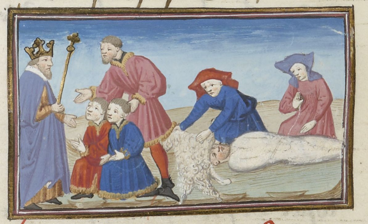 Parigi, Bibliothèque Nationale de France, Fr. 239, f. 261v. Giosefo e Melisso vengono condotti al cospetto di Salomone; due donne cuciono un cadavere in un sudario (?).